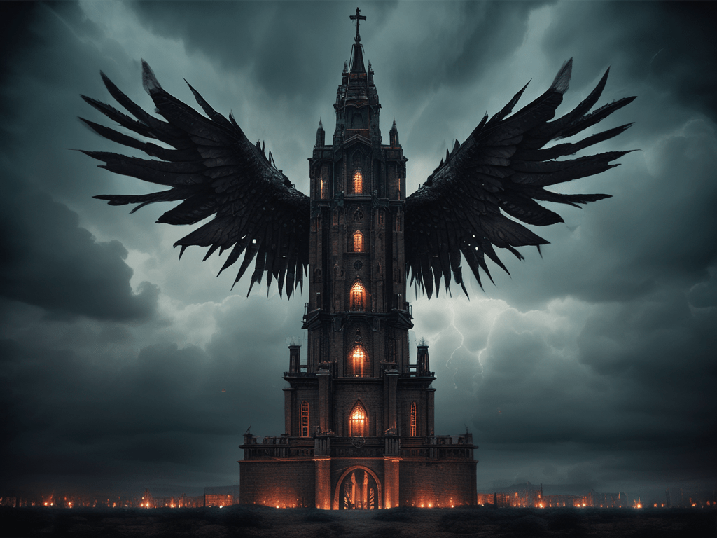El camino se vuelve más estrecho y los muros se abrazan hasta que solo puedo avanzar detrás de ella. Al final hay un campo de colinas verdes y, en el centro de todo, está una torre como una lanza bajo la luz de la noche. Sobre la entrada está el símbolo de un ojo, en cada extremo se extienden grandes alas encadenadas.